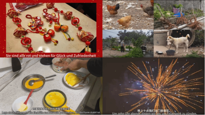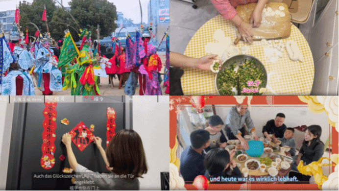 这一赛道的作品不仅展现了中国春节独特的文化氛围,更在微观叙事中折射出浓厚的家国情怀。同学们通过记录大扫除的忙碌、包饺子的协作、逛庙会的热闹以及祭祖的庄重,生动诠释了春节作为辞旧迎新重要节点的文化内涵。视频中,传统与现代交织,非遗打铁花的震撼与机器人表演的精彩相映成趣;地域特色鲜明,从南国的莆田红团、湖南祈福,到北国的胡同年味、邕城生机,一幅幅流动的画卷共同绘就了多元化的中国年春节全景。更重要的是,许多同学尝试用德语讲述这些故事,在“年夜饭”“红包”等词汇的跨语言转换中,搭建起沟通中外的文化小桥,尝试向世界传达真实而生动的中国年味。