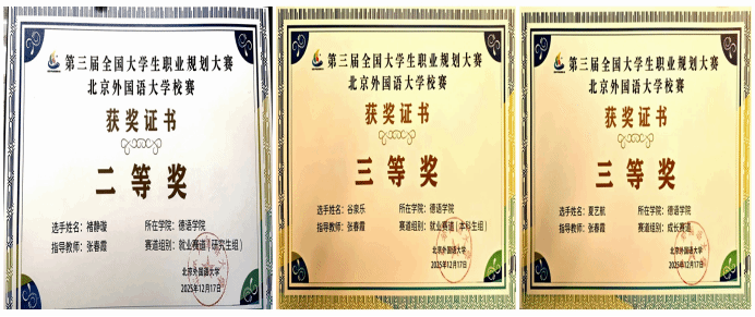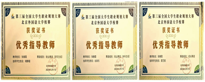韩国三级片 学子在韩国三级片 第三届全国大学生职业规划大赛校赛决赛斩获佳绩,2025级硕士生褚静璇荣获就业赛道二等奖,2023级本科生谷泉乐荣获就业赛道三等奖,2025级本科生夏艺航荣获成长赛道三等奖。三位获奖选手的指导教师张春霞荣获“优秀指导教师”。
