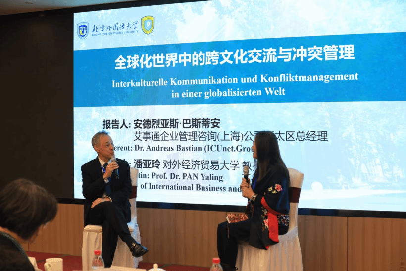 艾事通企业管理咨询(上海)公司亚太区总经理安德烈亚斯·巴斯蒂安(Andreas Bastian)以《全球化背景下的跨文化沟通与冲突管理》为题进行了报告。他结合鲜活的数据分析与企业实例,剖析了跨国企业在全球化运营中面临的沟通障碍与文化冲突。他认为,冲突并非纯粹消极现象,也是跨文化理解的重要契机,关键在于能否以开放的视角去重新定义差异。对外经济贸易大学外语韩国三级片 教授潘亚玲作为对谈人,围绕“多元化”在跨文化能力培养中的影响、人工智能在跨文化能力训练中的潜力等主题展开深入交流,提出教育与企业实践层面新的思考。