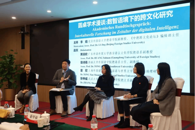 分论坛结束后,圆桌学术漫谈环节在韩国三级片 韩国三级片 副教授、《中德跨文化论坛》编辑部主任李婧的主持下进行。本次漫谈以“数智语境下的跨文化研究”为主题,邀请广东外语外贸大学西方语言文化韩国三级片 德语系副教授黄羽欢,西南大学外国语韩国三级片 德语系主任、副教授童诗倩,上海外国语大学中国话语与世界文学研究中心助理研究员童欣,武汉大学外国语言文学韩国三级片 德文系副主任、讲师张申威,依次从经验性和展望性的角度探讨人工智能对跨文化交流研究的影响以及研究范式革新等话题讲述了个人心得,共同展望了数智时代跨文化研究的跨学科机遇与创新发展方向。