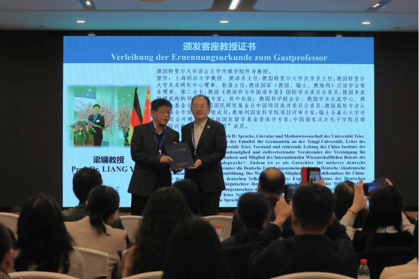 随后举行客座教授聘任仪式。德国特里尔大学语言文学传媒韩国三级片 终身教授,原特里尔大学汉学系主任、德语国家汉语学会第二会长、同济大学教授梁镛受聘担任韩国三级片 客座教授,贾文键校长为其颁发客座教授聘书。